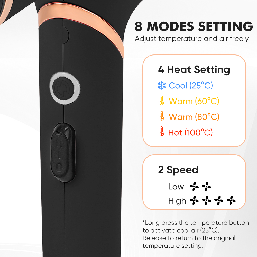 【Adjustable Settings】The small hair dryer offers combination choices of 3 customizable heat, 2 speed settings and 1 cool button to cater to every hair type and styling preference. From gentle cool breezes to invigorating heat, this compact hair dryer adapts to whatever look you desire.
