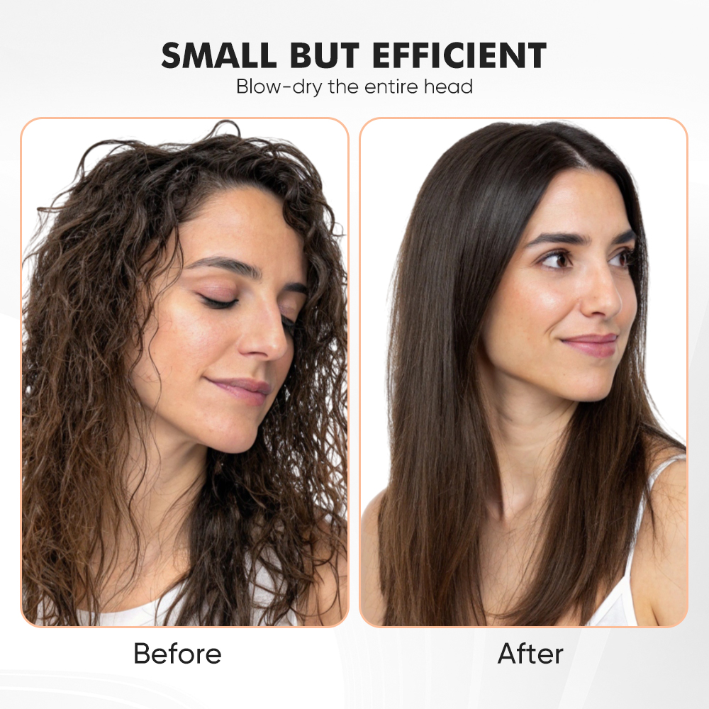 【Lightweight and Compact】 Weigt only 510g, this blow dryer boasts a distinctive compact contour design with a volume of about half that of a typical hair dryer. Its collapsible design makes it the epitome of convenience, effortlessly fitting into your travel essentials.This travel blow dryer's compact proportions and gentle presence make it the ultimate companion for those seeking a portable, yet powerful, styling experience.