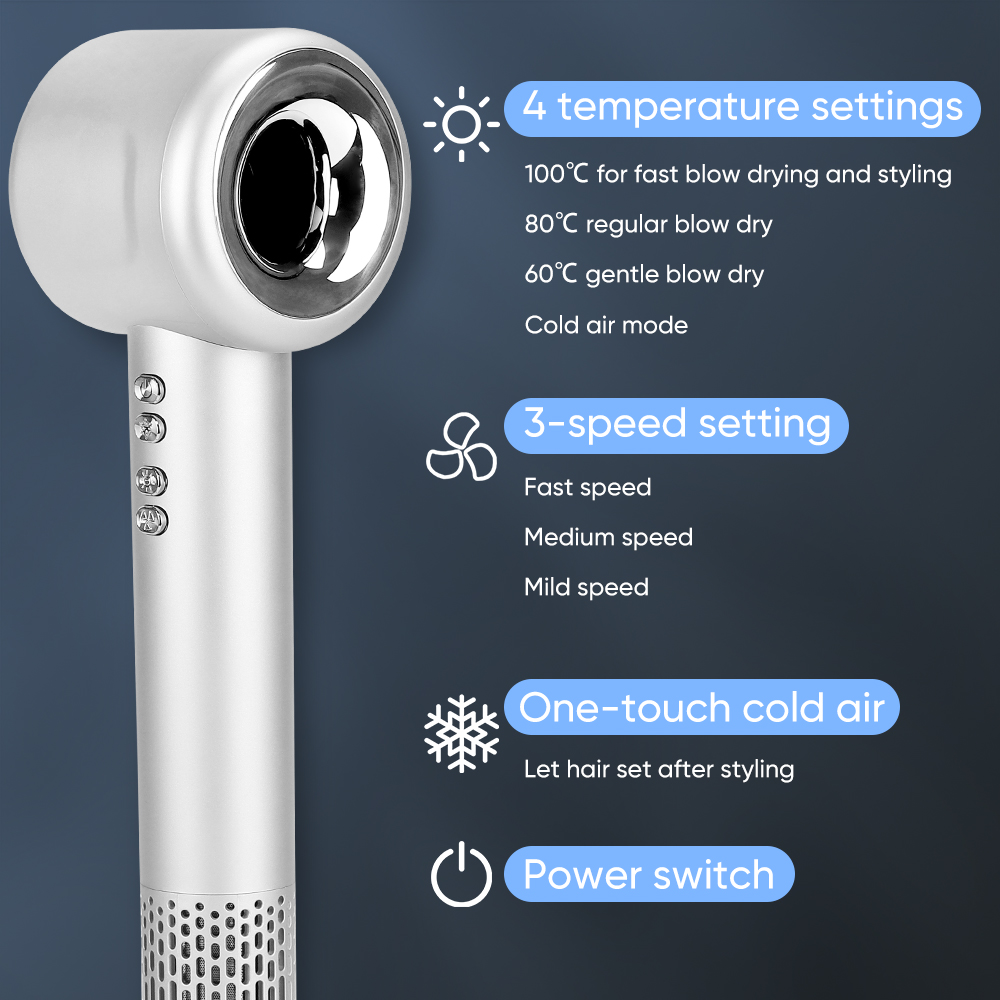You can use this hair blower dryer to choose the appropriate temperature and wind speed to style quicker,with 4 temperatures and 3 speeds for choosing.