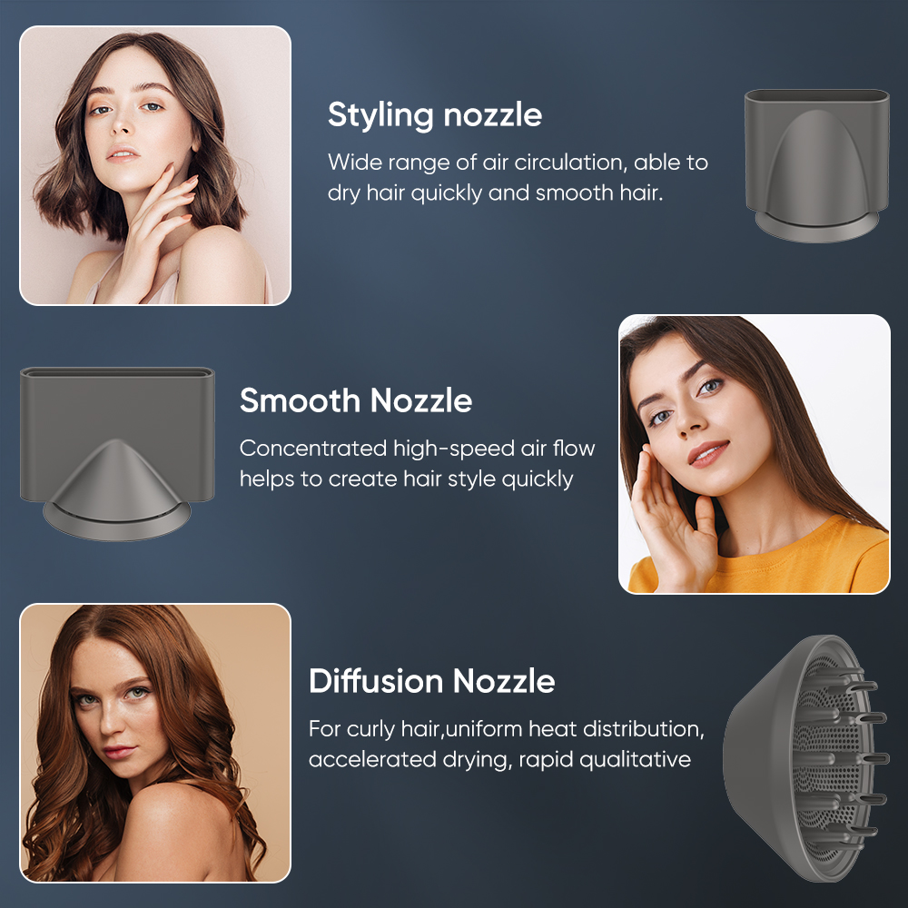 • Super hair dryer have 3 new version magnetic styling accessories:styling nozzle,smooth nozzle,diffusion nozzle for different hair style using.This hair dryer with safely filter prevent hair from being sucked into the hair dryer and cleaning timely.