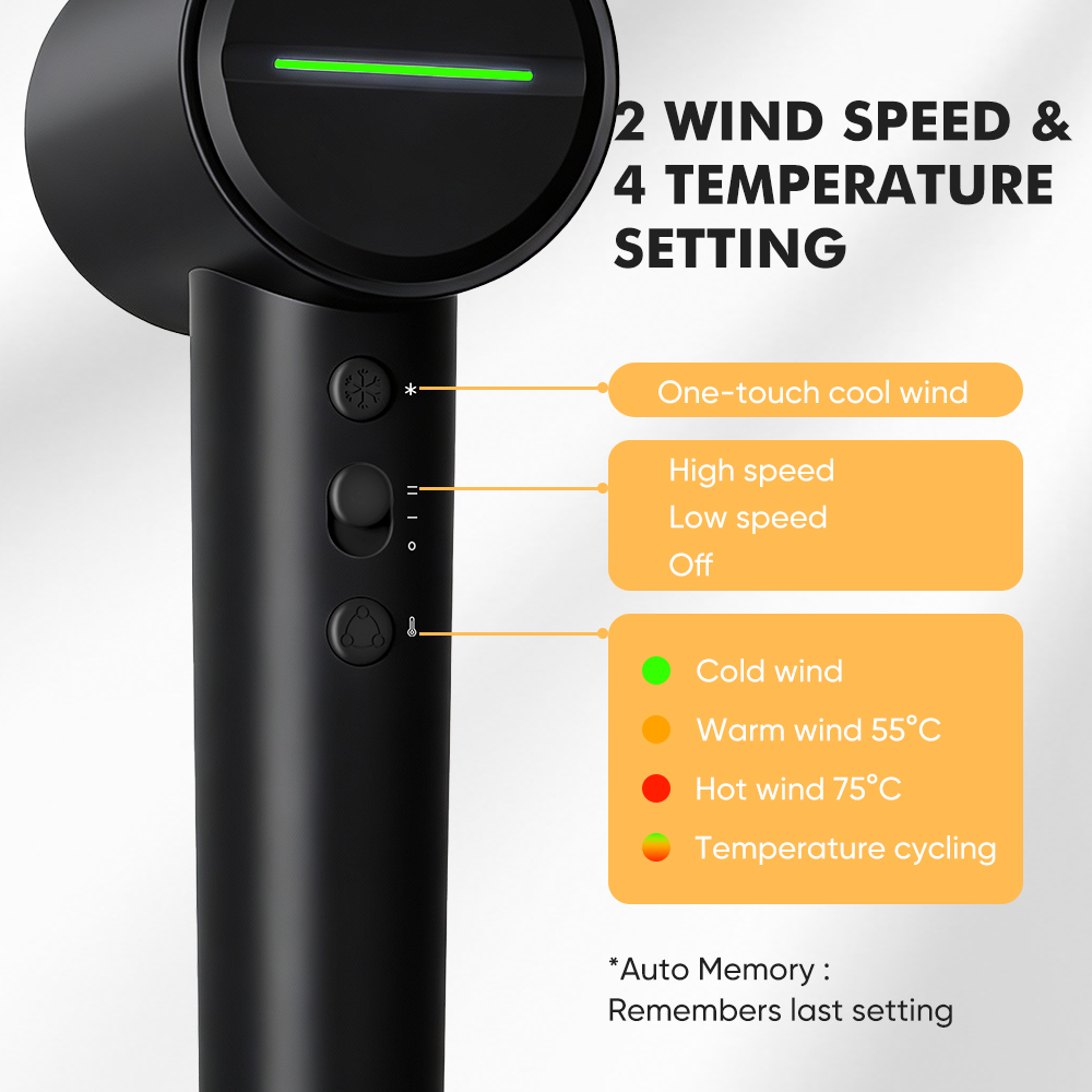 You can use this hair blower dryer to choose the appropriate temperature and wind speed to style quicker,with 4 temperatures and 3 speeds for choosing.