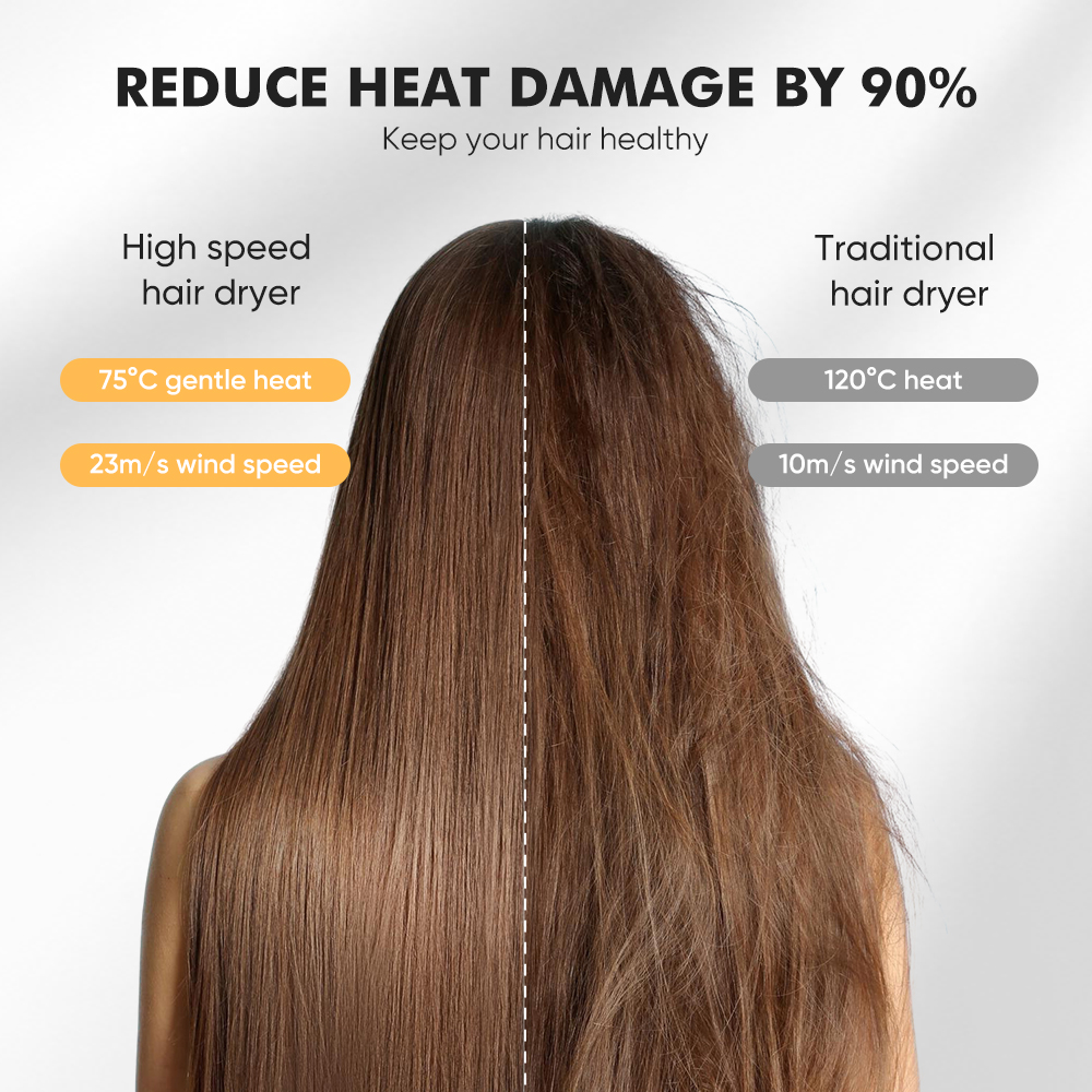 110000rpm Ionic Hair Dryer can dry hair in a short time,which is 2x faster than traditional hairdryers.Usually,it takes 2-8 minutes to dry hair.