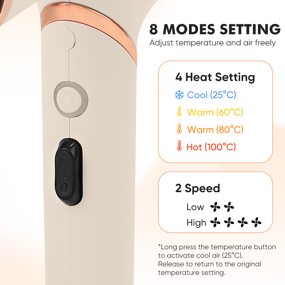 【Adjustable Settings】The small hair dryer offers combination choices of 3 customizable heat, 2 airflow settings and 1 cool button to cater to every hair type and styling preference. From gentle cool breezes to invigorating heat, this compact hair dryer adapts to whatever look you desire.